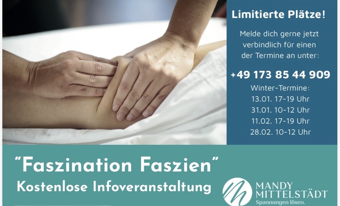 Ich freue mich riesig, euch mitteilen zu können, dass ich mein Angebot erweitert habe und euch nun auch mit Faszienbehandlungen unterstützen kann! Eine tolle Ergänzung für noch mehr Wohlbefinden und Beweglichkeit.